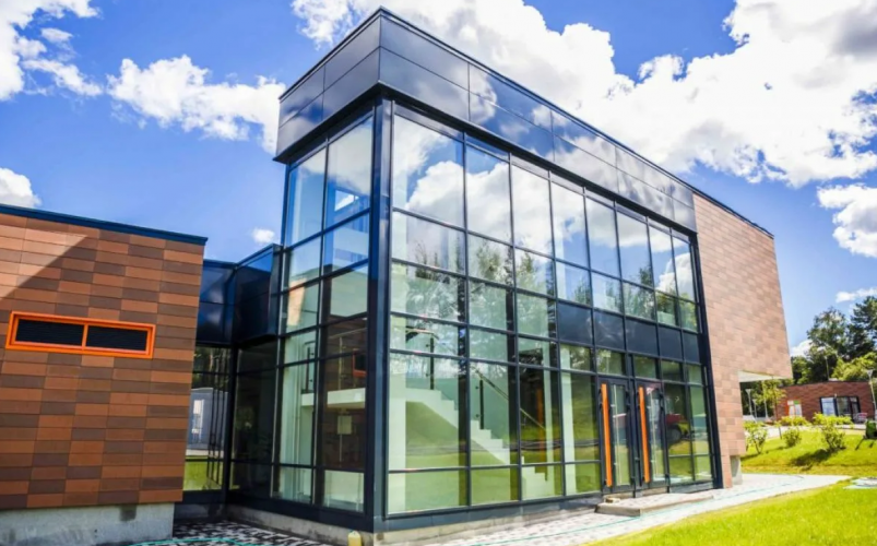 Алюминиевые фасады могут быть как простыми—прямоугольной формы, так и сложными—с трапецевидными , гнутыми-радиусными или комбинированными участками остекления.